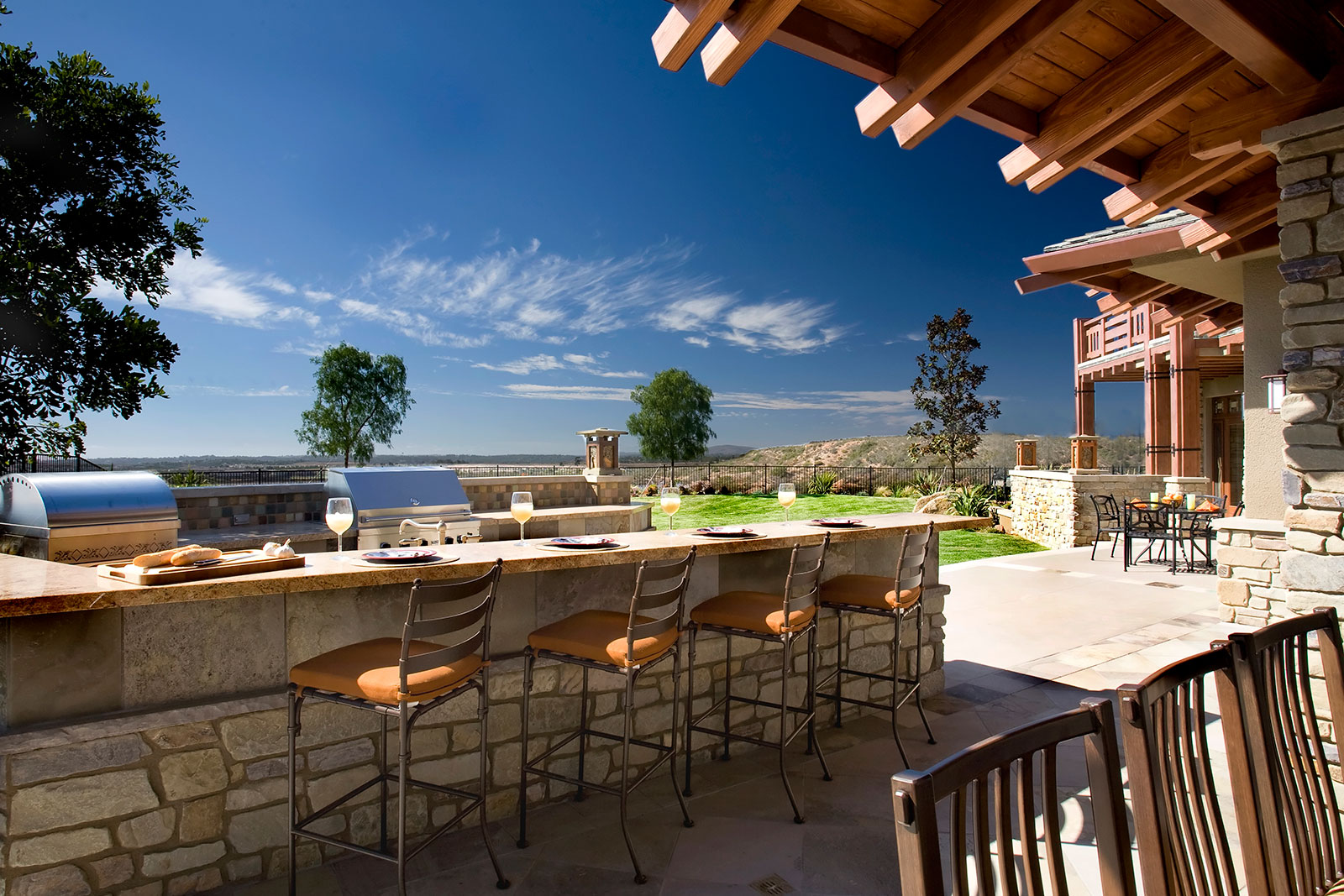 A swimming pool with attached water feature, spa and full outdoor kitchen are located close to the gathering spaces of the residence to provide that indoor-outdoor lifestyle so welcome in Southern California. Large open lawn areas provide for multiple uses, and a separate children’s play space incorporates slides, swings, climbers and a trampoline in a protected area of the lot.